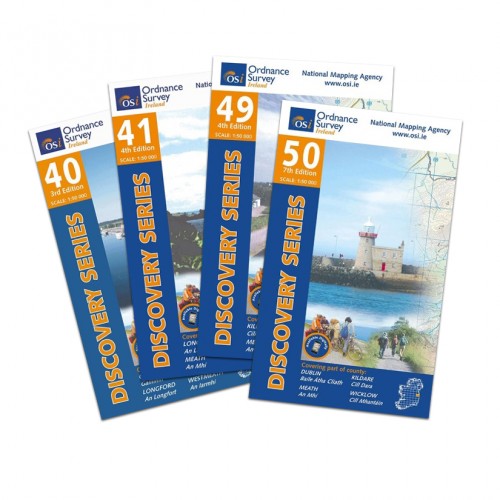 This is a special offer on the four main maps covering the Royal Canal Way and an option to add a more detailed map for around the centre of Dublin City. The Discovery Series maps 40, 41, 49, 50 are all at 1:50,00 and the Dublin City Centre Tourist Map is at 1:7,500 and all are published by Ordnance Survey Ireland.